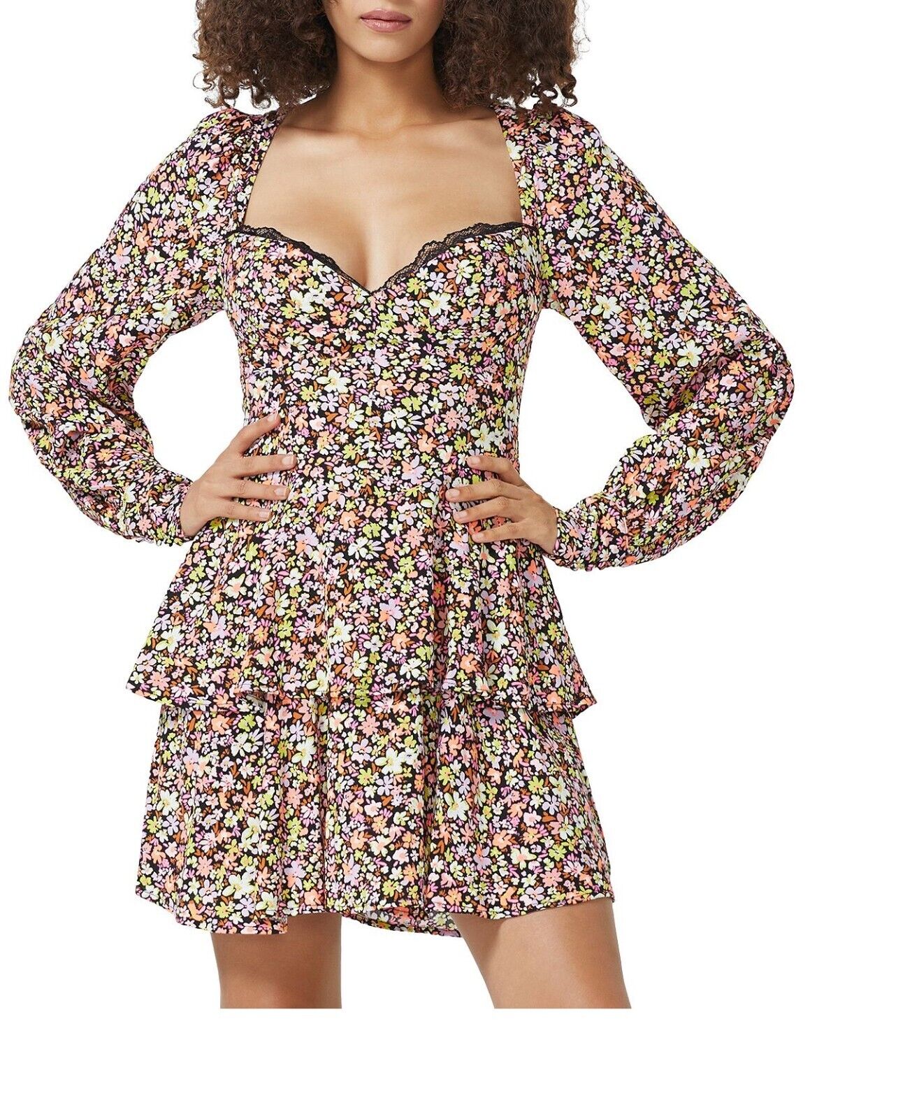 AFRM Women's Modesto Sweetheart Mini Dress Multi Color B4HP $138 Fits true to size, order your normal size Fitted at the bust and waist, relaxed at the hip Slightly stretchy fabric Designed for a mini length Approx. 34" long, based on a size small Model measurements: 5'10" height, 33.5" bust, 23.5" waist, 34.5" hips, wearing a size small Sweetheart neck with lace trim Long sleeves, banded cuffs Back zip closure Tiered skirt Allover floral print Fit-and-flare silhouette Imported 55% viscose/45% rayon Dry clean