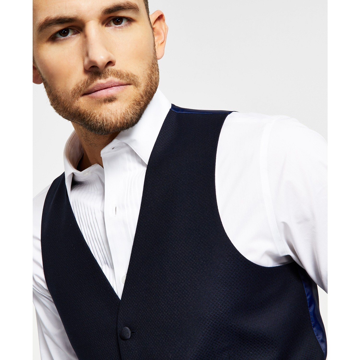 Look sharp in any sophisticated setting with the streamlined silhouette and tonal diamond-grid pattern of this tuxedo vest from Alfani.