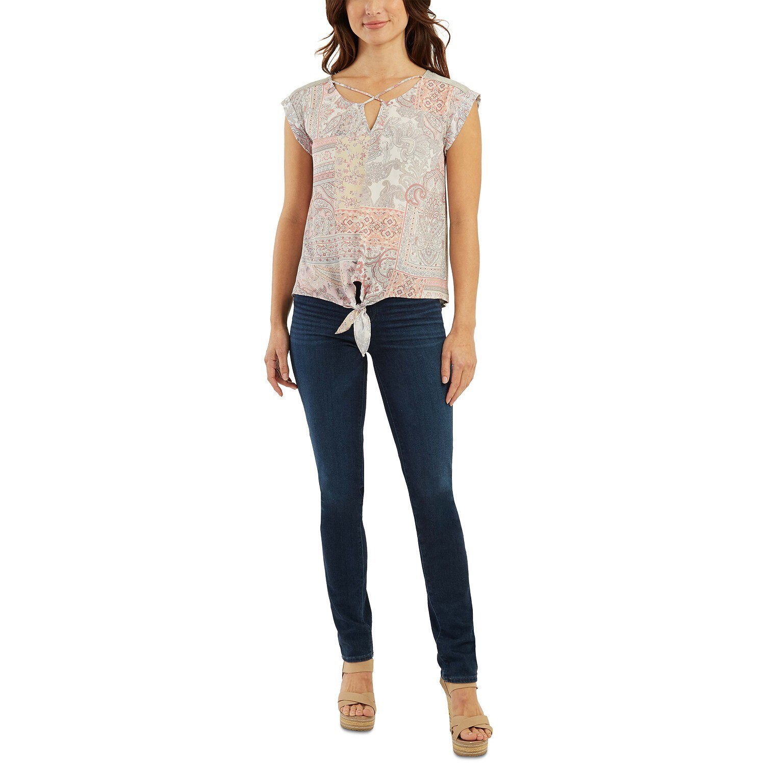 BCX Juniors’ Tie-Front Mixed-Media Top Natural Paisley XS B4HP