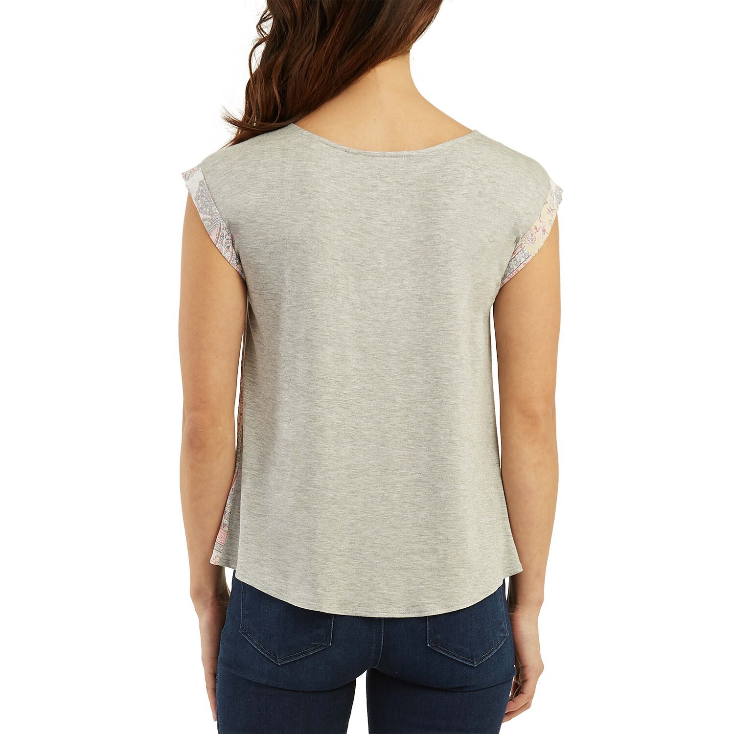 A smart look coming and going: this BCX top features a patchwork-style print in front and a softly space-dyed back.