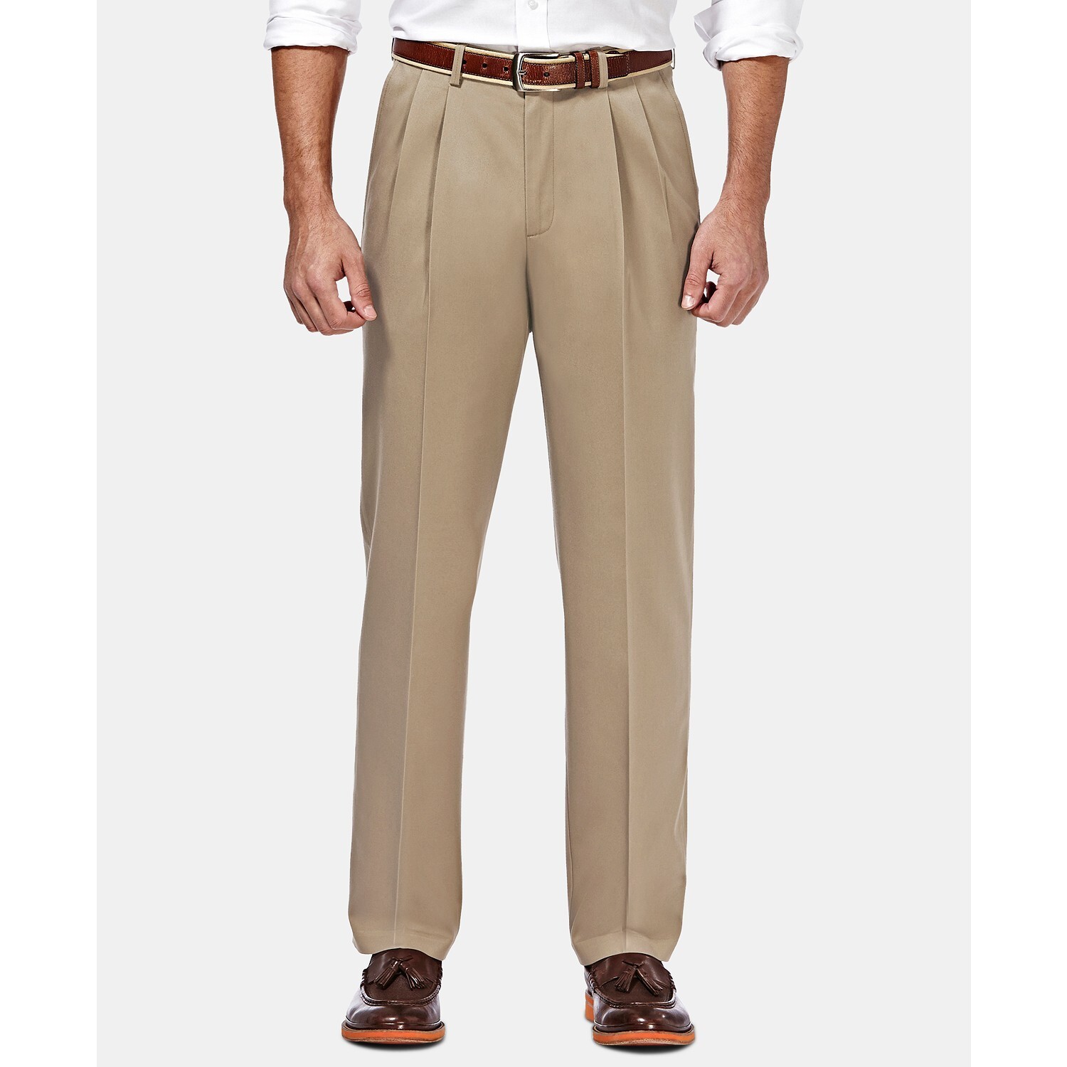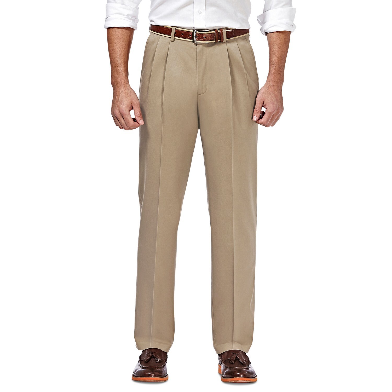 Haggar’s classic-fit pleated pants have the perfect amount of roomy stretch to keep you comfortable in all your professional to formal settings.