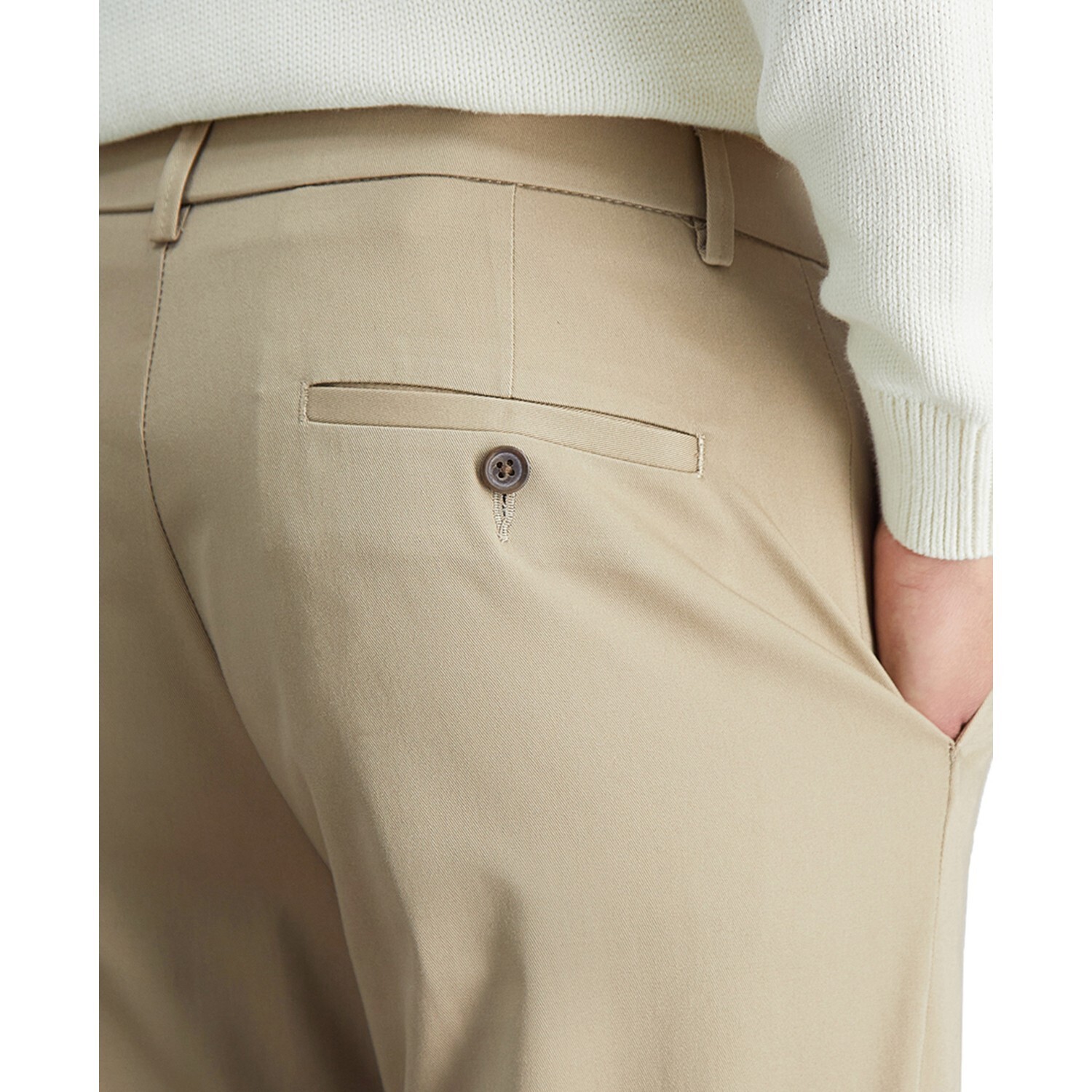 Two hand pockets at front; two welt pockets with button-through closures at back