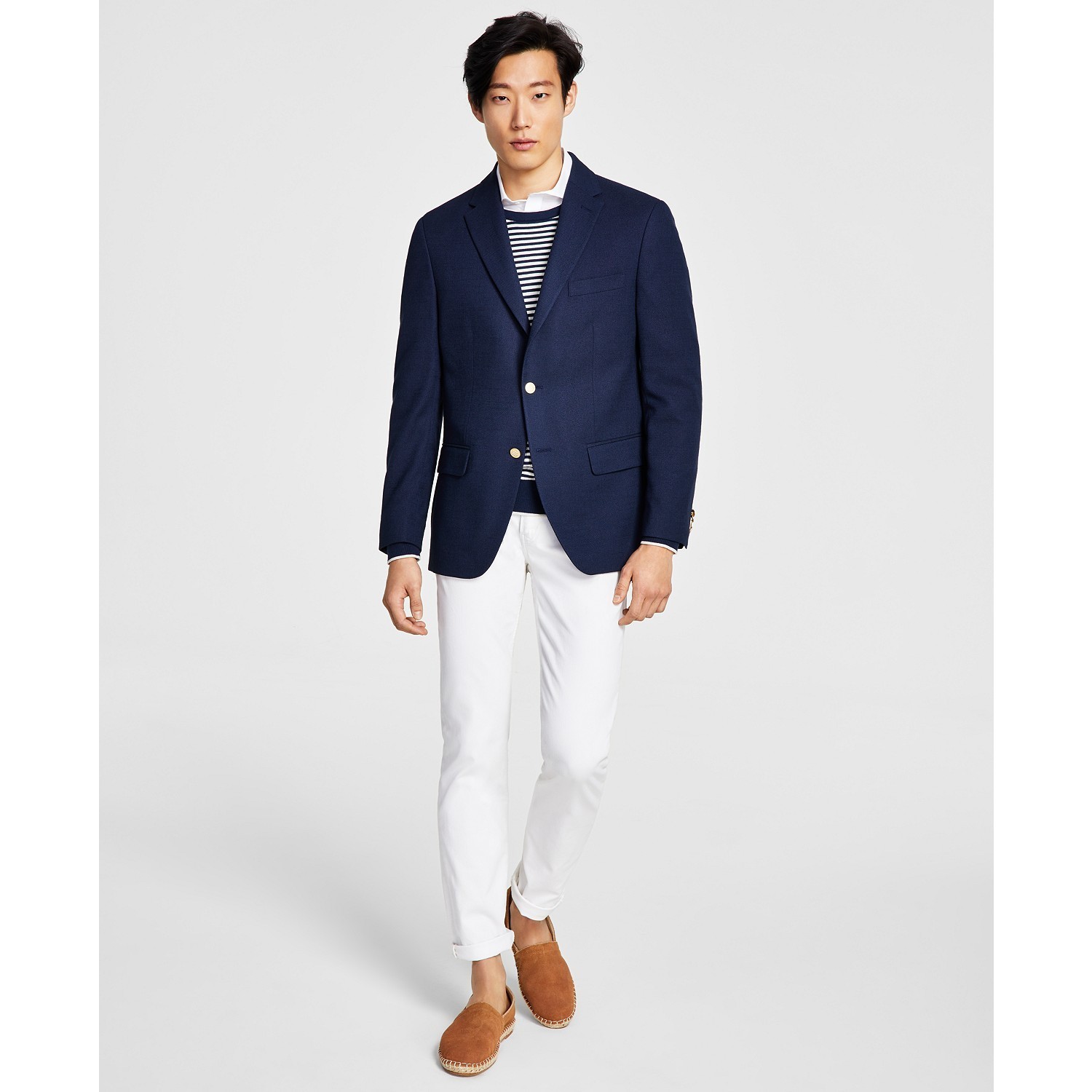 A true classic, this modern-fit navy weave blazer from Tommy Hilfiger features a goldtone buttons and an athletic cut through the shoulders, chest and waist.